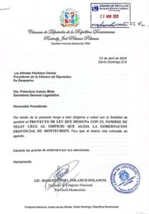 El diputado Rosendy Polanco sometió un proyecto de ley con el objetivo de que el edificio que aloja la Gobernación Provincial de Montecristi lleve el nombre de Nelsy Cruz, en honor a su destacada labor como funcionaria pública. La propuesta busca rendir homenaje a quien ha sido una figura clave en el desarrollo social de la provincia.
